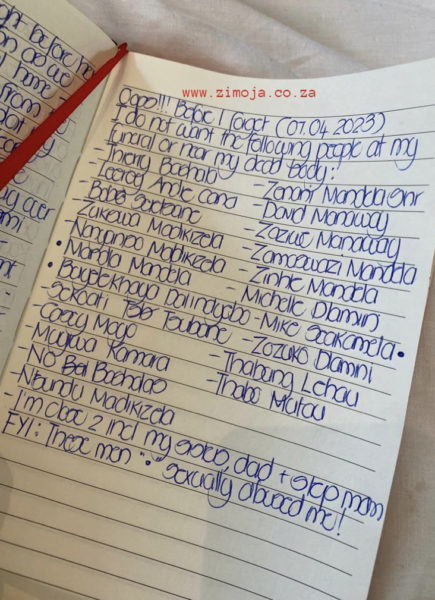 In her diary, the name of the people she doesn’t want at her funeral are, Thiery Bashala, who is the father of her two children. Leeroy Andie Cana, the father of her last born Zingce. She also listed some people from the Mandela and Madikizela family; Zenani Mandela Snr, Mandla Mandela, Zukiswa Madikizela, Nsundu Madikizela, and Buyelekhaya Dalindyebo.